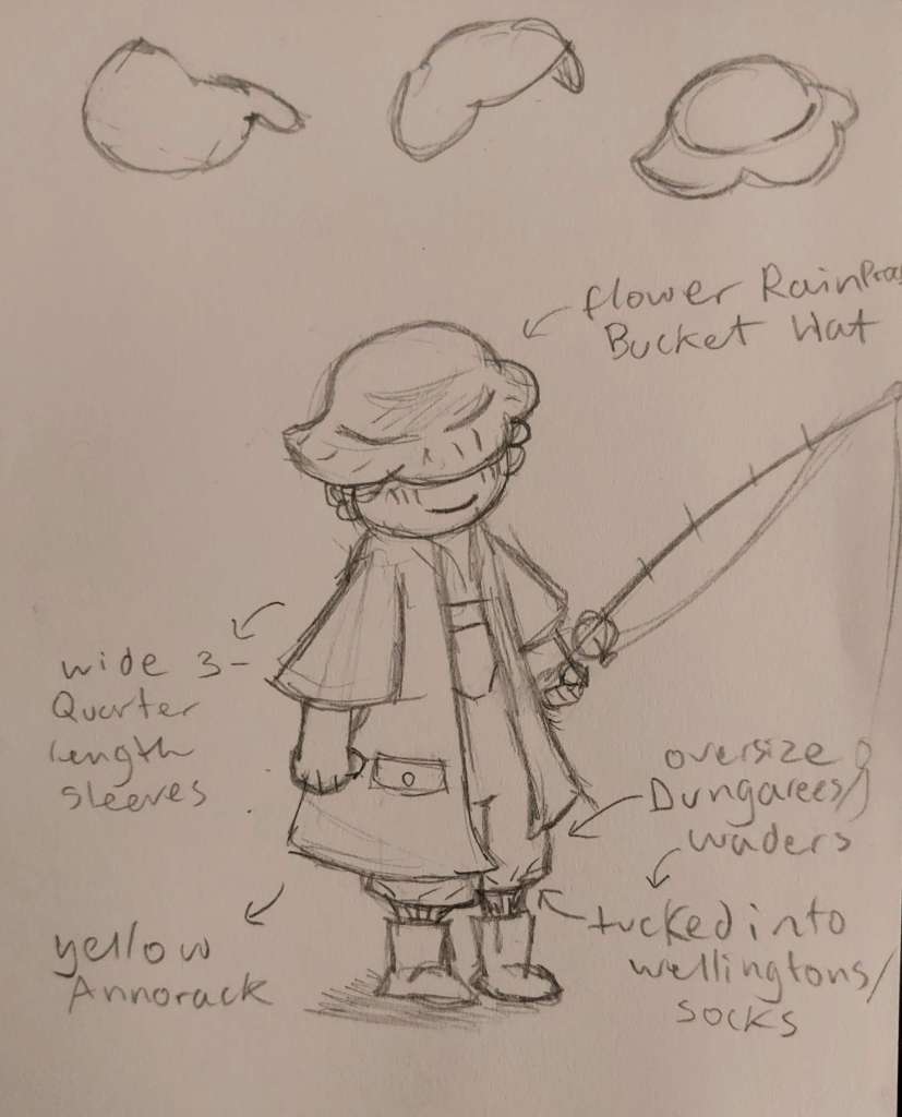 As I mentioned back in 2020, one of the goals was to create an interesting main character that players could resonate with while playing as them in the world. After envisioning what that would look like for the last few years, it’s definitely a short non-binary character, with slightly curled short hair, fishing waders/dungarees, that classic yellow anorak, wellies, and a unique flower-shaped bucket hat.
